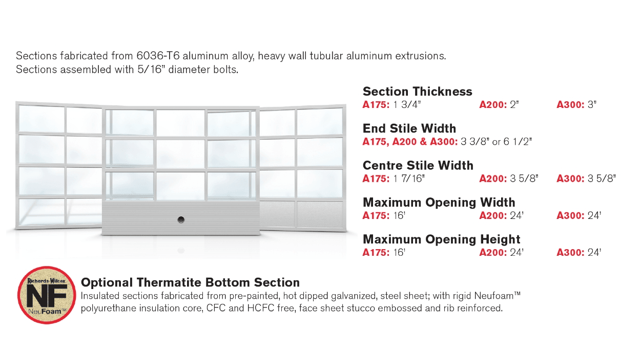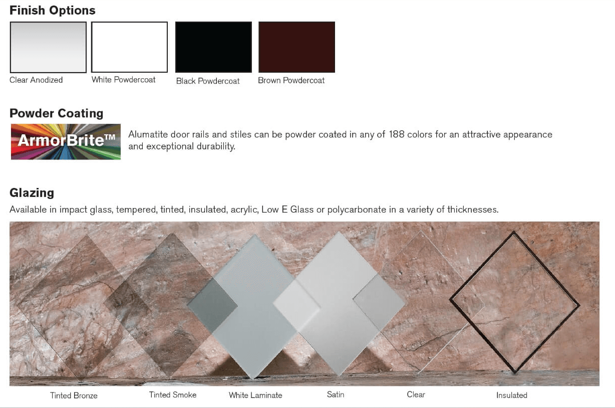 Alumatite Door Systems are designed to provide an attractive and practical solution when maximum light and/or visibility is required. Built to withstand heavy use and high traffic using extruded aluminum alloy rails and stiles with a full width integral horizontal reinforcing truss at each pair of meeting rails. Highest quality hardware components provide years of dependable operation. Choose from a variety of finish and glazing options or configure your door with Thermatite panels for extra strength and additional energy savings.